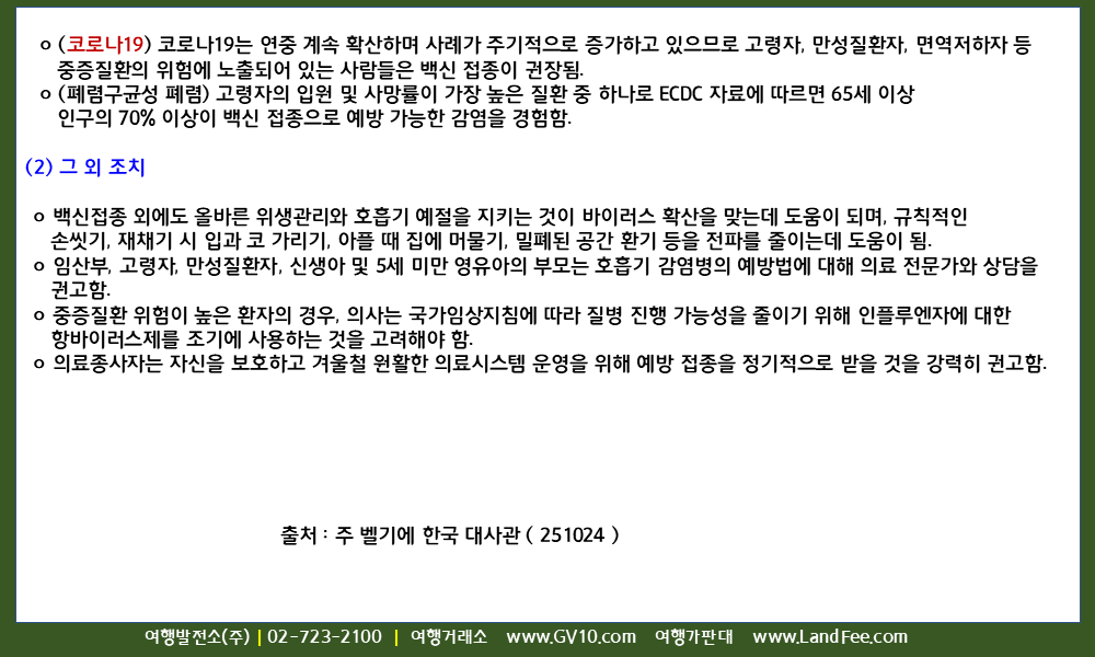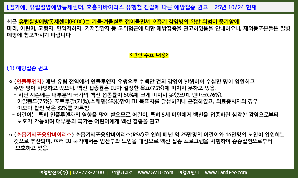[벨기에] 유럽질병예방통제센터, 호흡기바이러스 유행철 진입에 따른 예방접종 권고 - 25년 10/24 현재