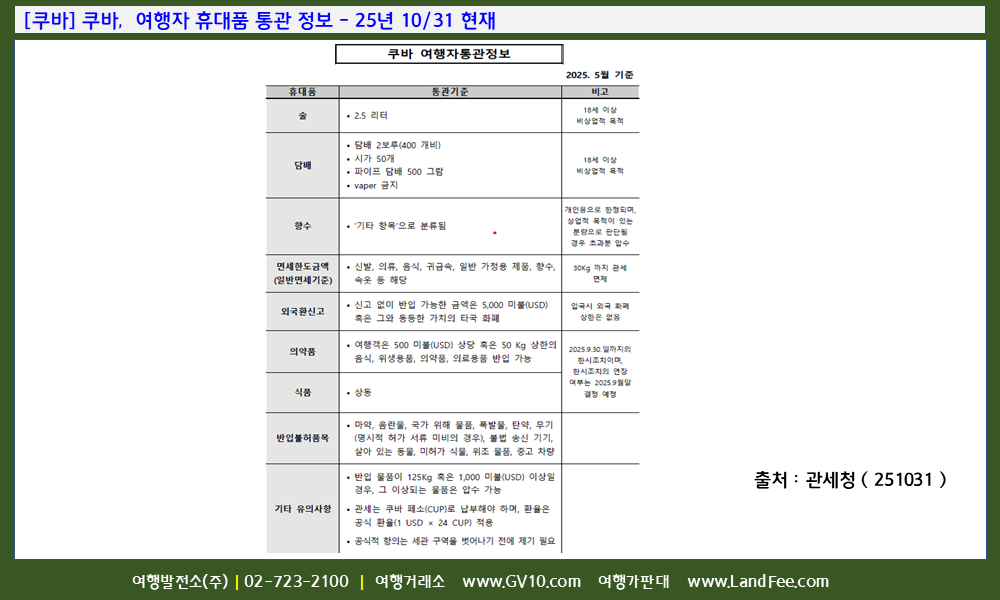 [쿠바] 쿠바, 여행자 휴대품 통관 정보 - 25년 10/31 현재