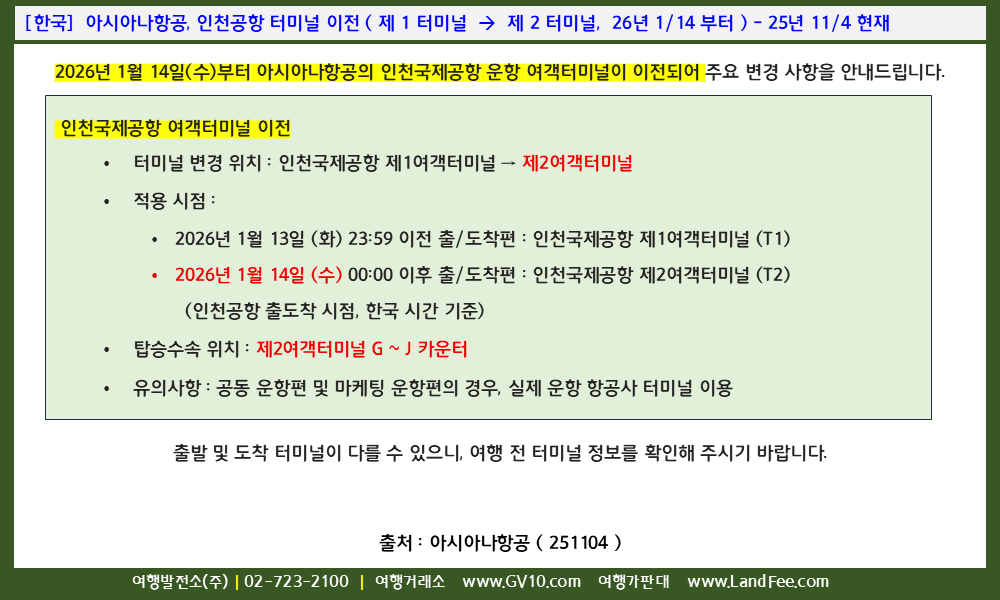[한국] 아시아나항공, 인천공항 터미널 이전 ( 제 1 터미널 -> 제 2 터미널, 26년 1/14 부터 ) - 25년 11/4 현재