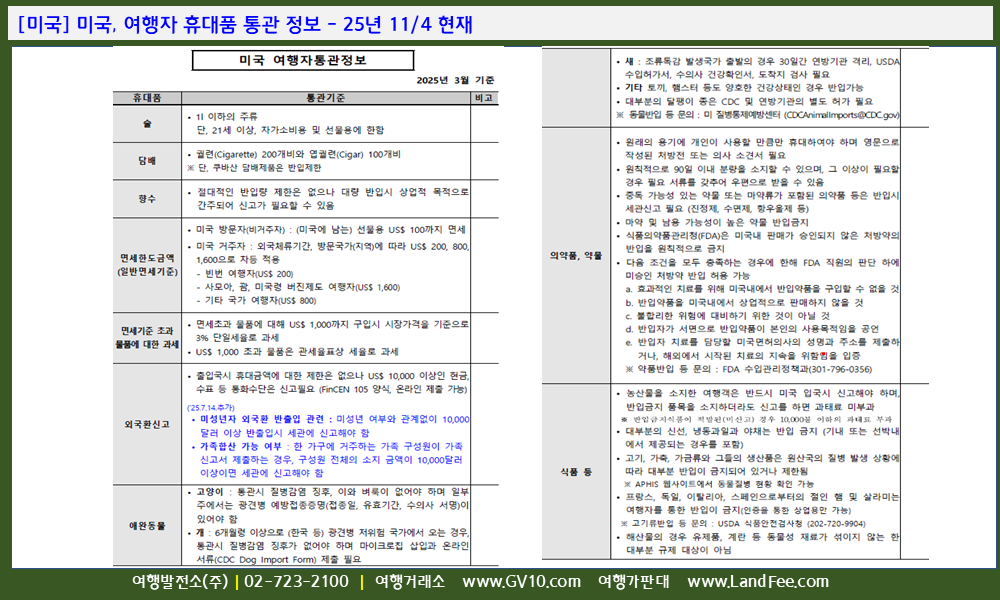 [미국] 미국, 여행자 휴대품 통관 정보 - 25년 11/4 현재