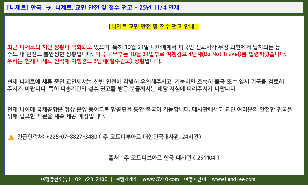 [니제르] 한국 -> 니제르, 교민 안전 및 철수 권고 - 25년 11/4 현재