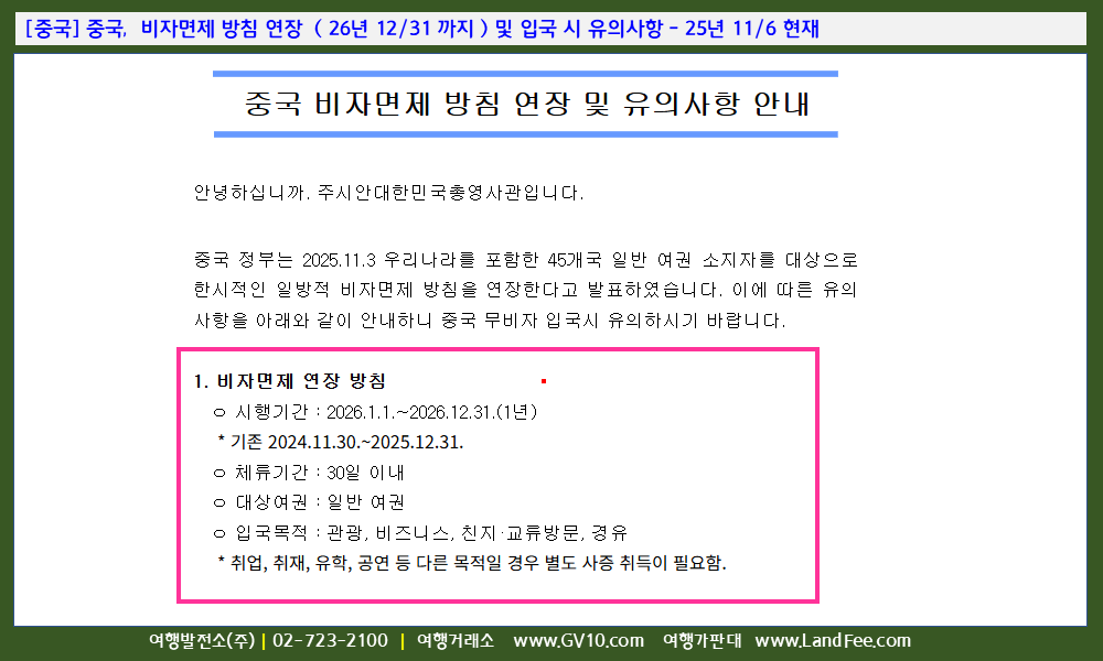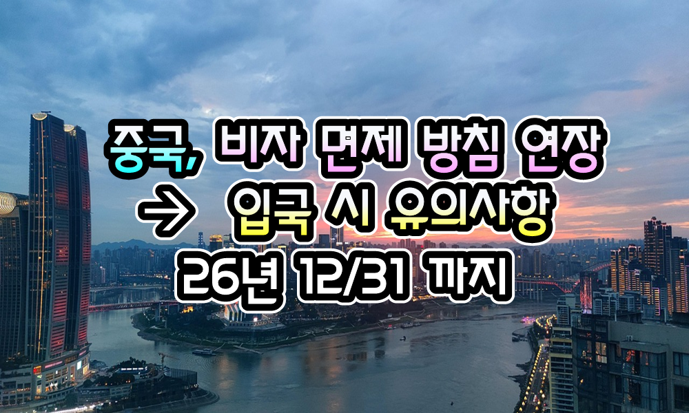 [중국] 중국, 비자면제 방침 연장 ( 26년 12/31 까지 ) 및 입국 시 유의사항 - 25년 11/6 현재