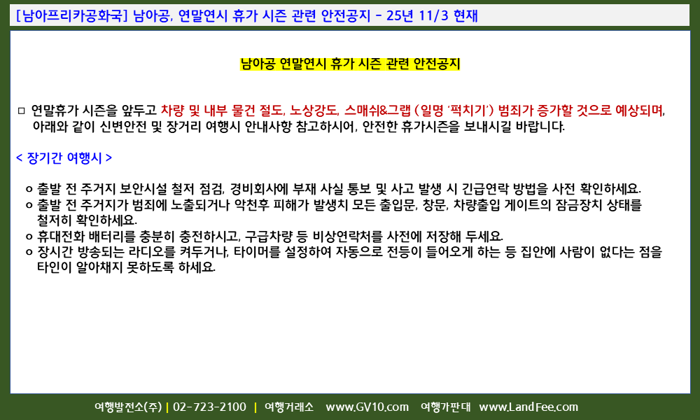 [남아프리카공화국] 남아공, 연말연시 휴가 시즌 관련 안전공지 - 25년 11/3 현재