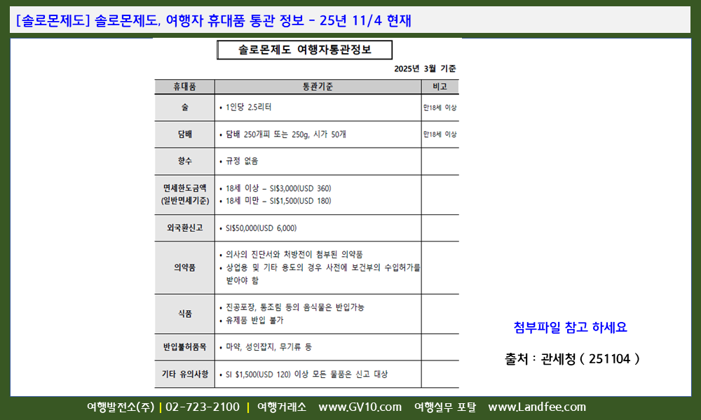 [솔로몬제도] 솔로몬제도, 여행자 휴대품 통관 정보 - 25년 11/4 현재