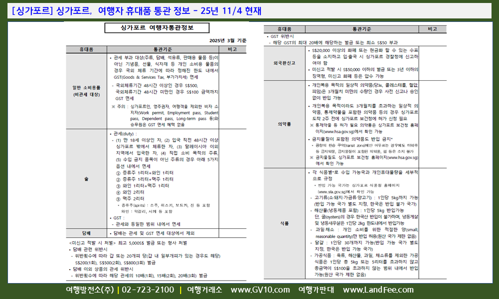 [싱가포르] 싱가포르, 여행자 휴대품 통관 정보 - 25년 11/4 현재