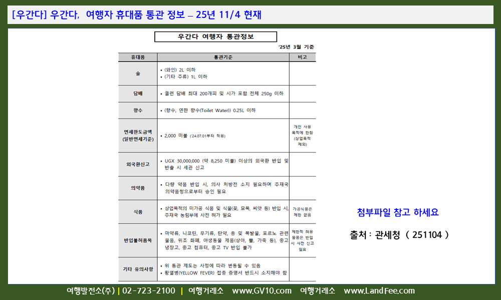 [우간다] 우간다, 여행자 휴대품 통관 정보 – 25년 11/4 현재