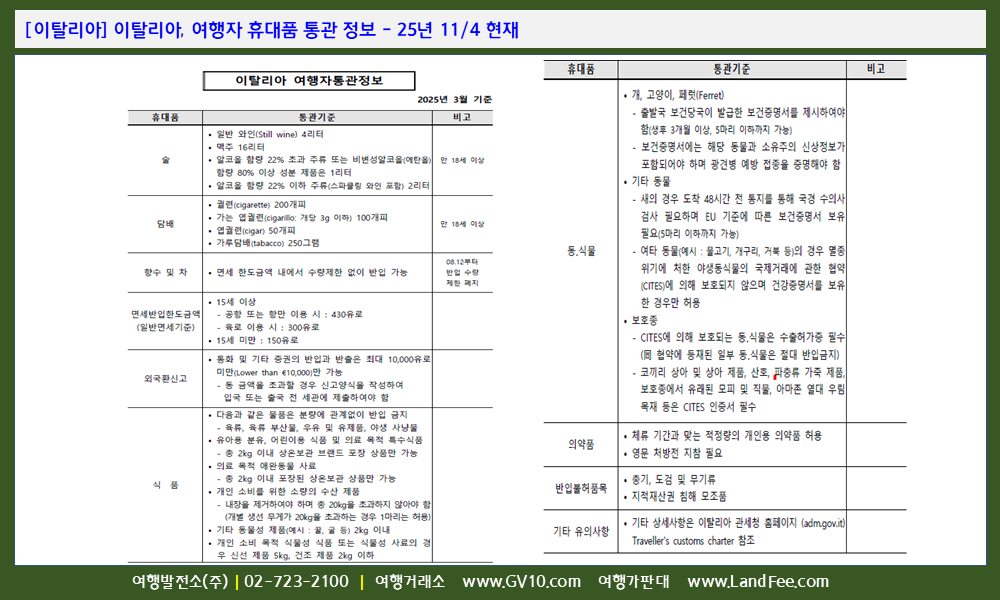 [이탈리아] 이탈리아, 여행자 휴대품 통관 정보 - 25년 11/4 현재