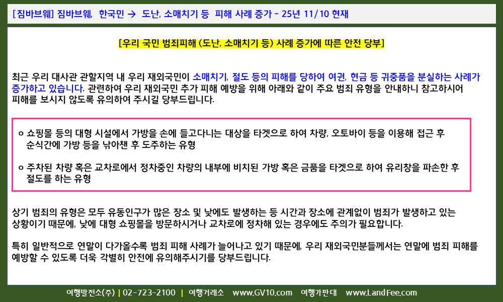 [짐바브웨] 짐바브웨, 한국민 -> 도난, 소매치기 등 피해 사례 증가 - 25년 11/10 현재