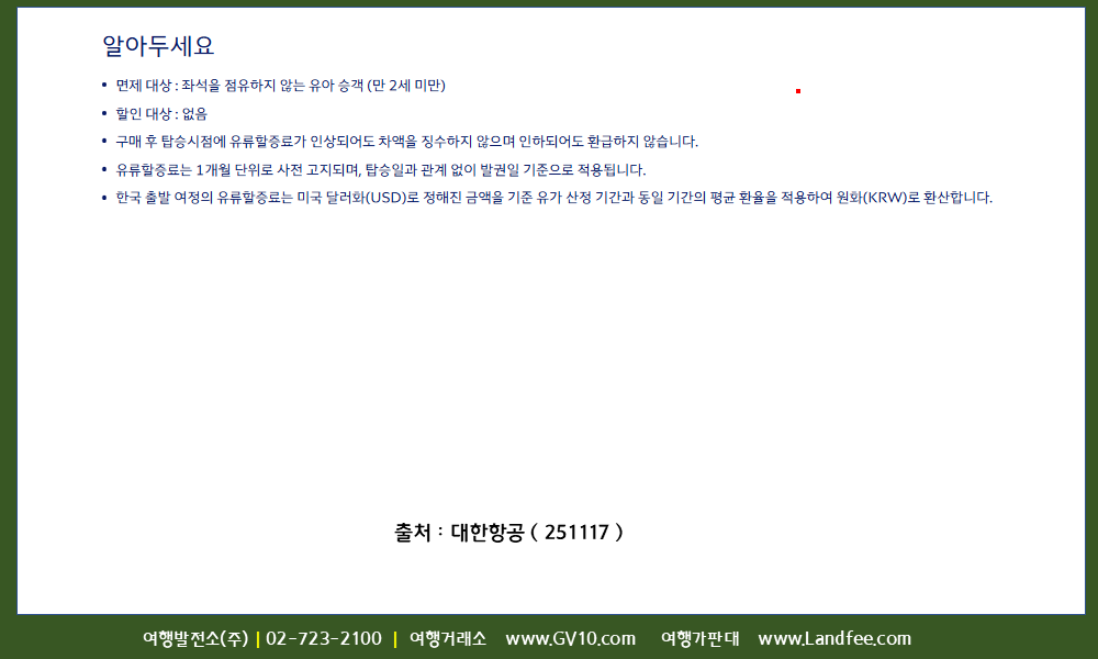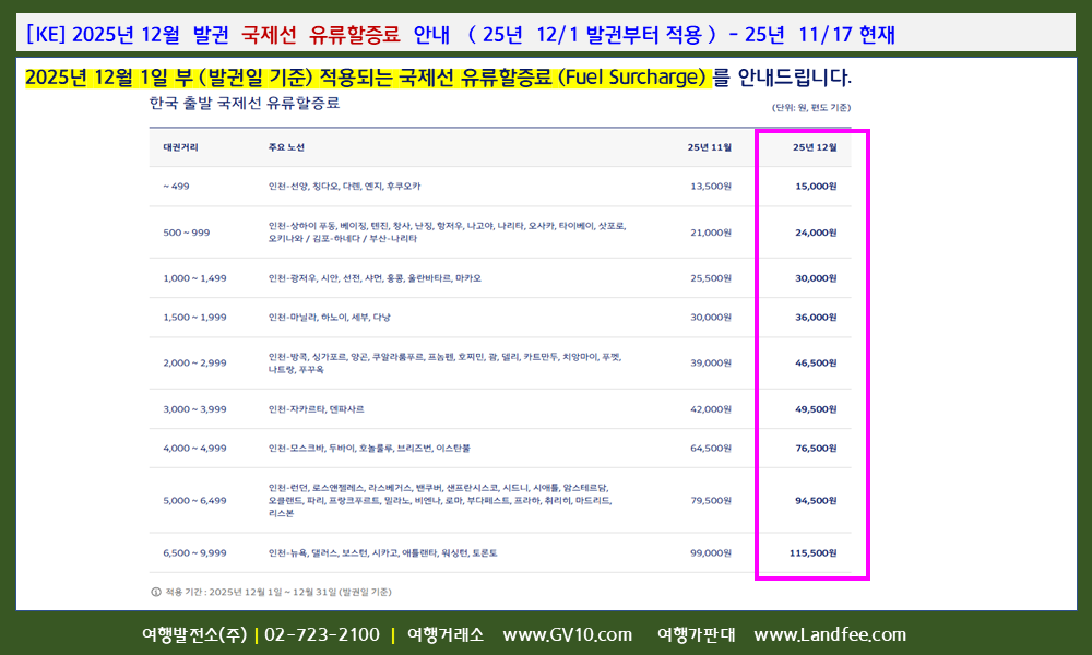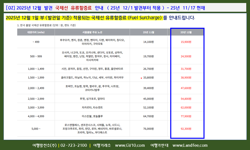 [KE/OZ] 2025년 12월 발권 국제선 유류할증료 안내 ( 25년 12/1 발권부터 적용 ) - 25년 11/17 현재