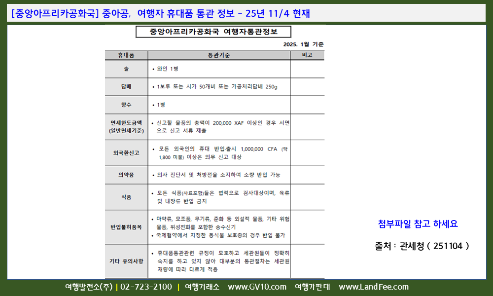 [중앙아프리카공화국] 중아공, 여행자 휴대품 통관 정보 - 25년 11/4 현재
