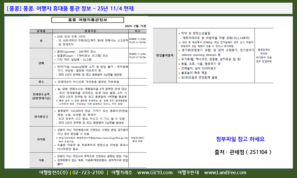 [홍콩] 홍콩, 여행자 휴대품 통관 정보 - 25년 11/4 현재