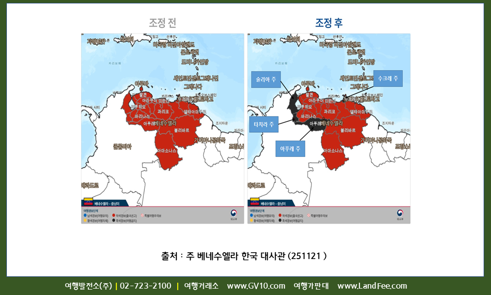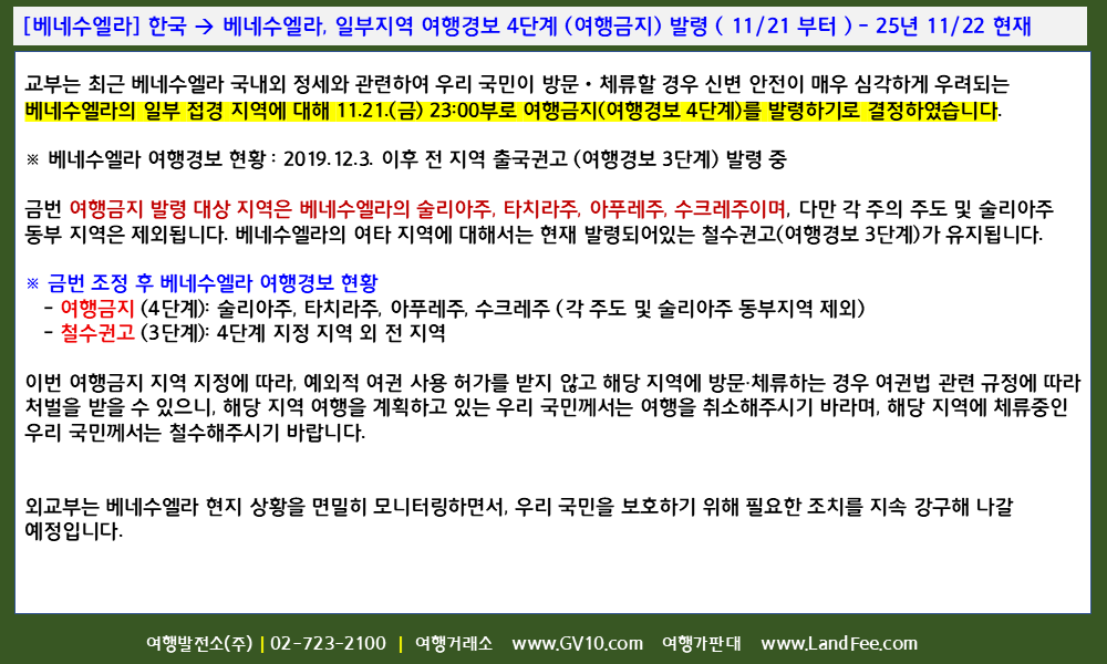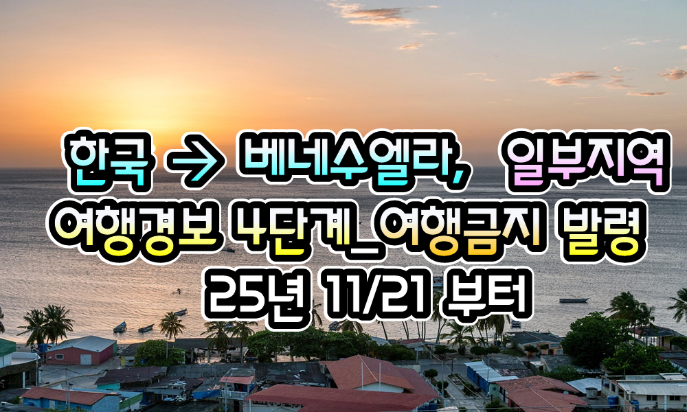 [베네수엘라] 한국 -> 베네수엘라, 일부지역 여행경보 4단계 ( 여행금지 ) 발령 ( 11/21 부터 ) - 25년 11/22 현재