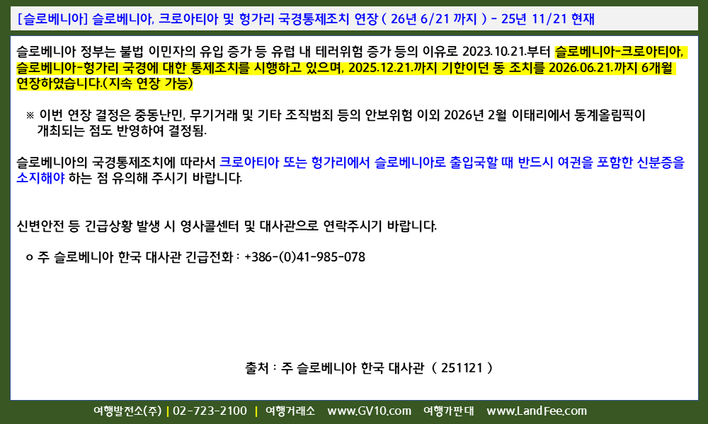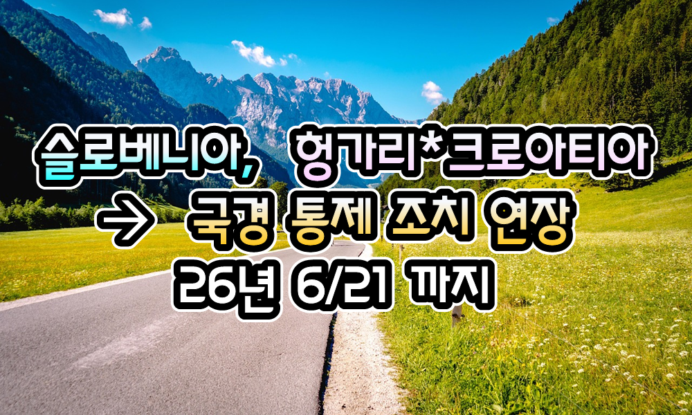 [슬로베니아] 슬로베니아, 크로아티아 및 헝가리 국경통제조치 연장 ( 26년 6/21 까지 ) - 25년 11/21 현재