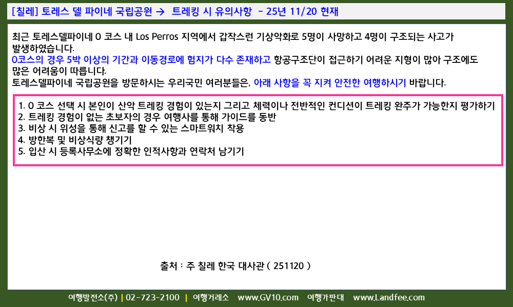 [칠레] 토레스 델 파이네 국립공원 -> 트레킹 시 유의사항 - 25년 11/20 현재