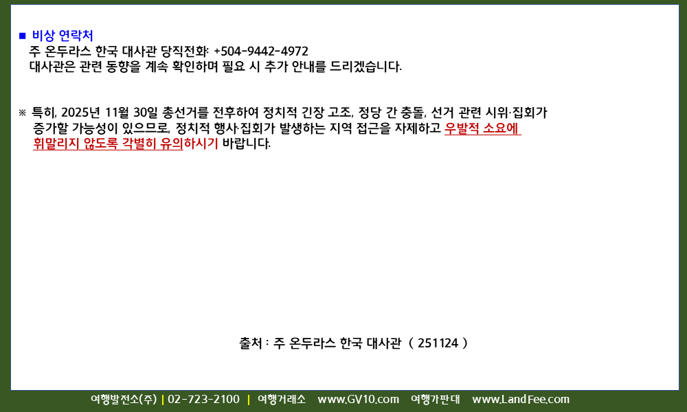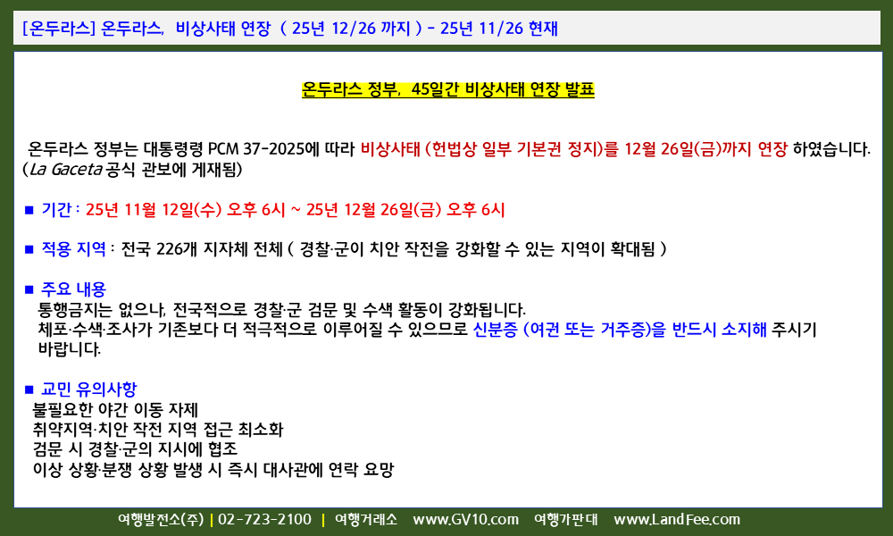 [온두라스] 온두라스, 비상사태 연장 ( 25년 12/26 까지 ) - 25년 11/26 현재