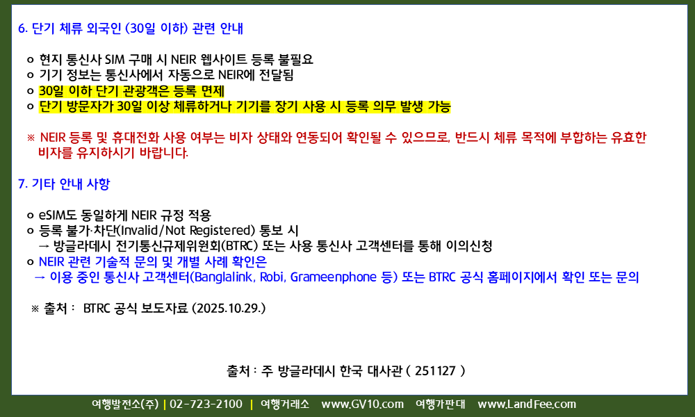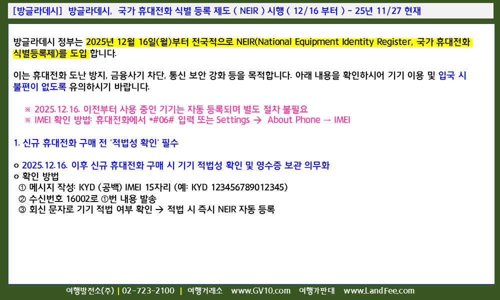 [방글라데시] 방글라데시, 국가 휴대전화 식별 등록 제도 ( NEIR ) 시행 ( 12/16 부터 ) - 25년 11/27 현재