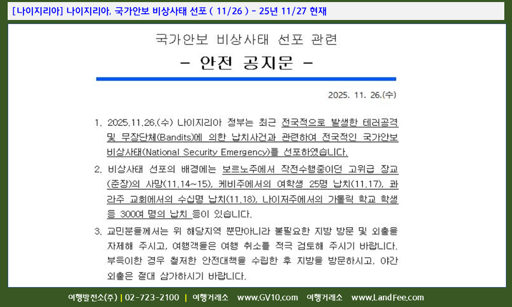 [나이지리아] 나이지리아, 국가안보 비상사태 선포 ( 11/26 ) - 25년 11/27 현재