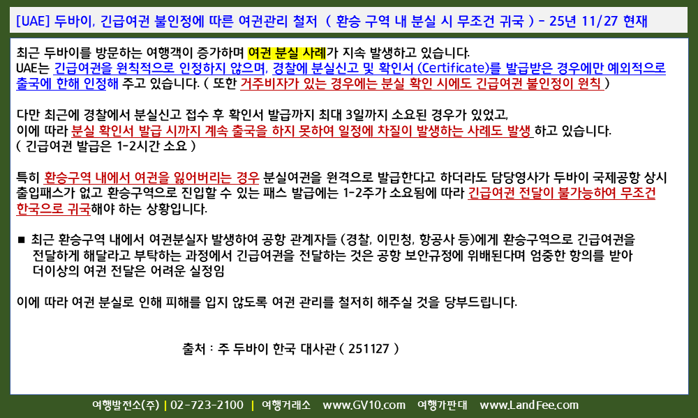 [UAE] 두바이, 긴급여권 불인정에 따른 여권관리 철저 ( 환승 구역 내 분실 시 무조건 귀국 ) - 25년 11/27 현재
