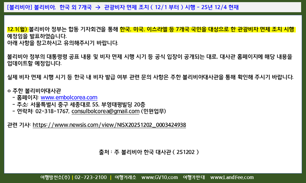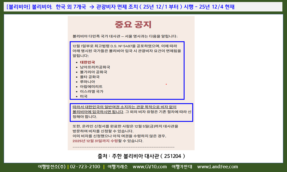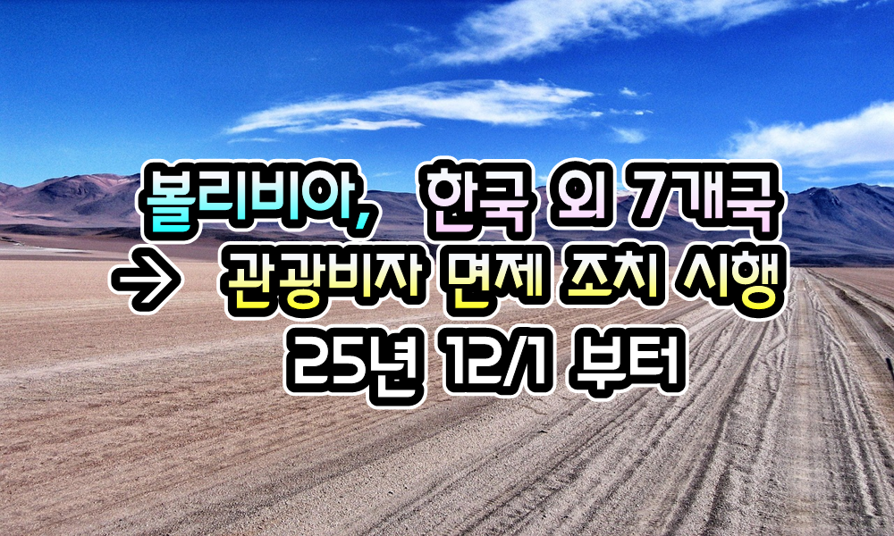 [볼리비아] 볼리비아, 한국 외 7개국 -> 관광비자 면제 조치 ( 25년 12/1 부터 ) 시행 - 25년 12/4 현재