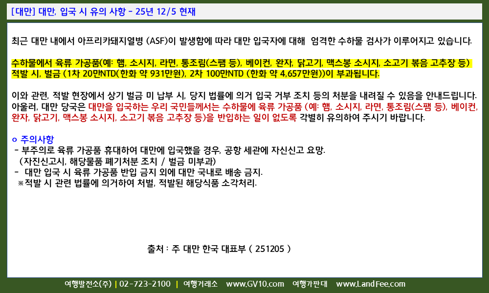 [대만] 대만, 입국 시 유의 사항 - 25년 12/5 현재