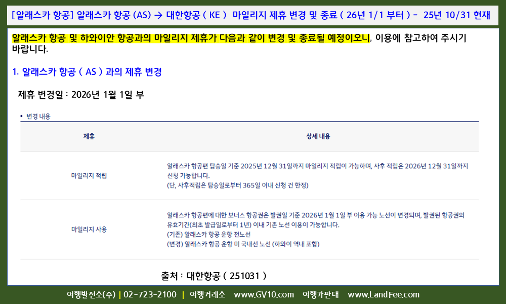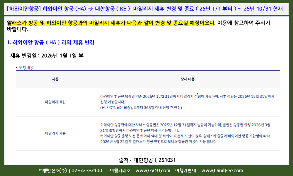 [하와이안항공/알래스카항공] 하와이안항공(HA)/알래스카항공(AS) -> 대한항공 ( KE ) 마일리지 제휴 변경 및 종료 ( 26년 1/1 부터 ) - 25년 10/31 현재