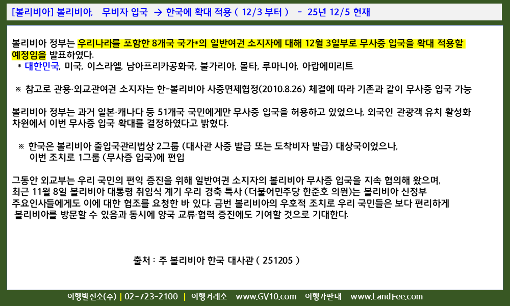 [볼리비아] 볼리비아, 한국민 -> 무비자 입국 허용 ( 12/3 부터 ) - 25년 12/6 현재