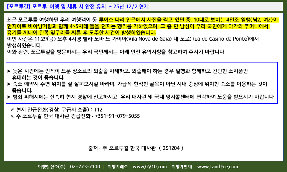 [포르투갈] 포르투, 여행 및 체류 시 안전 유의 - 25년 12/2 현재