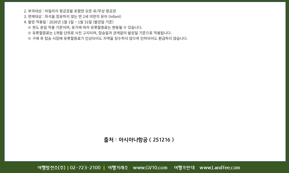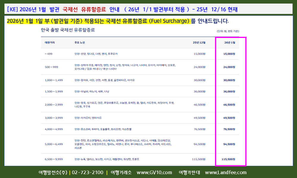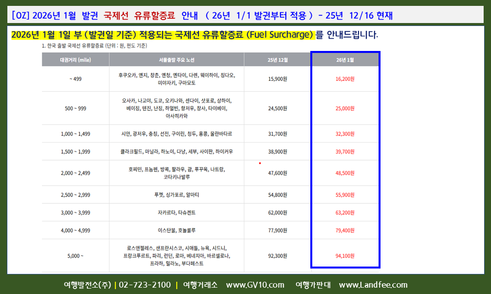 [KE/OZ] 2026년 1월 발권 국제선 유류할증료 안내 ( 26년 1/1 발권부터 적용 ) - 25년 12/16 현재