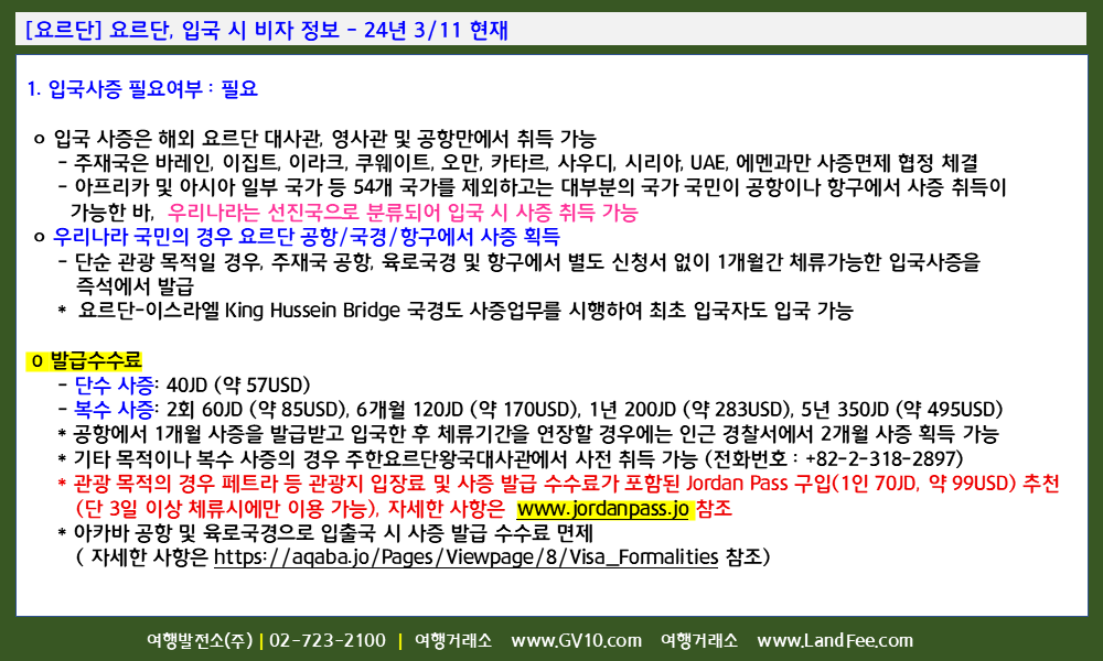 [요르단] 요르단, 입국 시 비자 정보 - 24년 3/11 현재