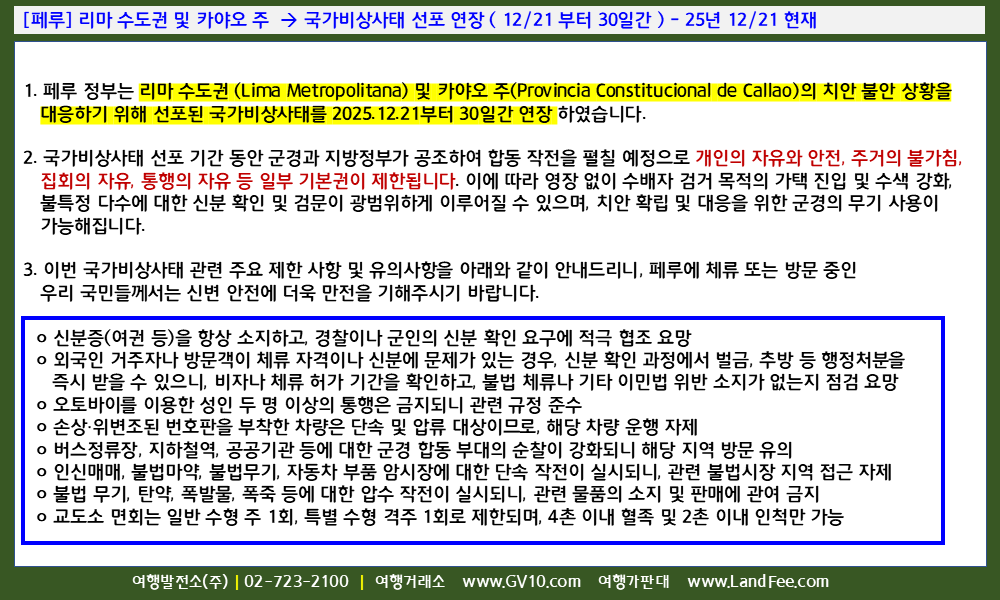 [페루] 리마 수도권 및 카야오 주 -> 국가비상사태 선포 연장 ( 12/21 부터 30일간 ) - 25년 12/21 현재