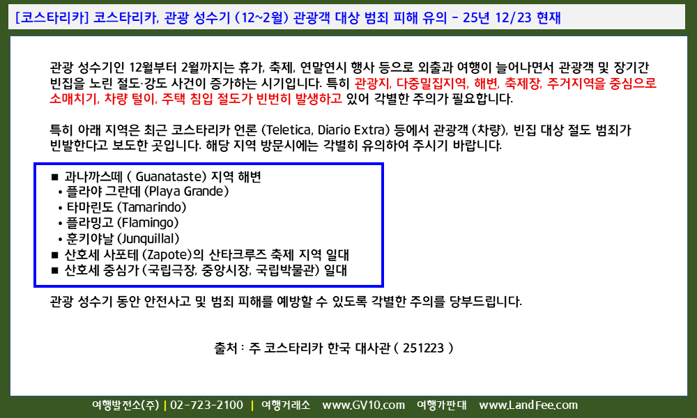 [코스타리카] 코스타리카, 관광 성수기 (12~2월) 관광객 대상 범죄 피해 유의 - 25년 12/23 현재