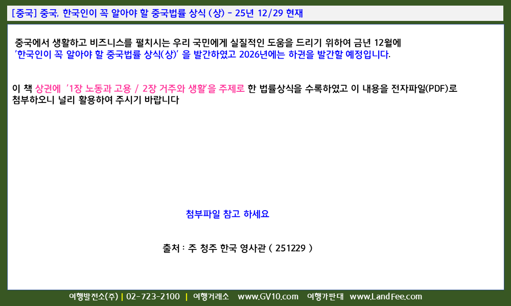 [중국] 중국, 한국인이 꼭 알아야 할 중국법률 상식 (상) - 25년 12/29 현재