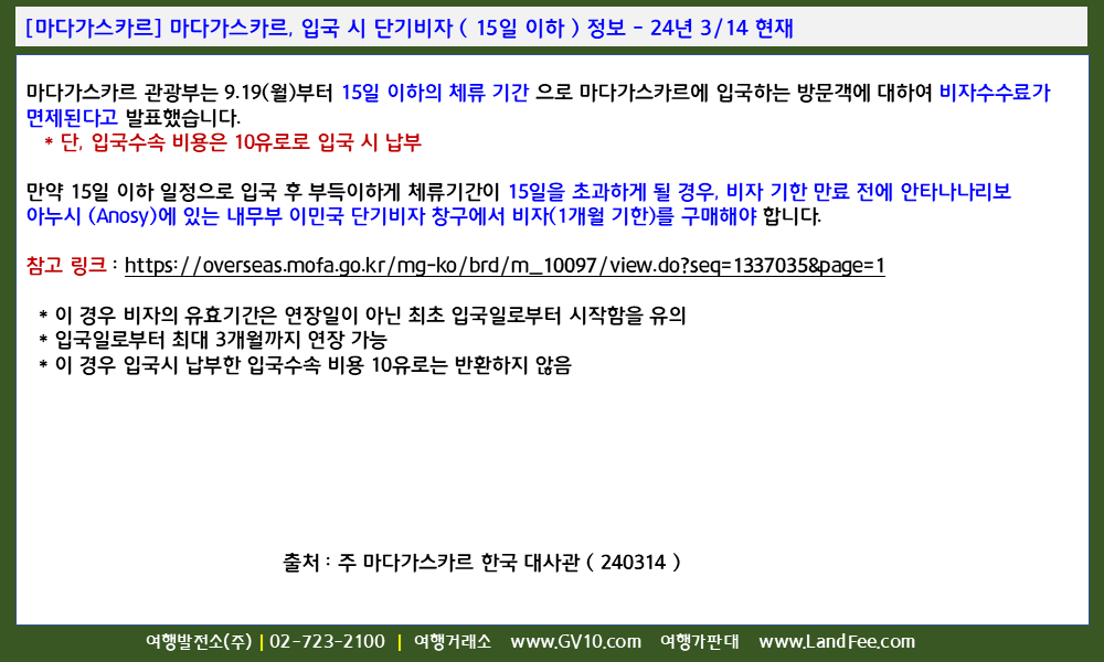 [마다가스카르] 마다가스카르, 입국 시 단기비자 ( 15일 이하 ) 정보 - 24년 3/14 현재