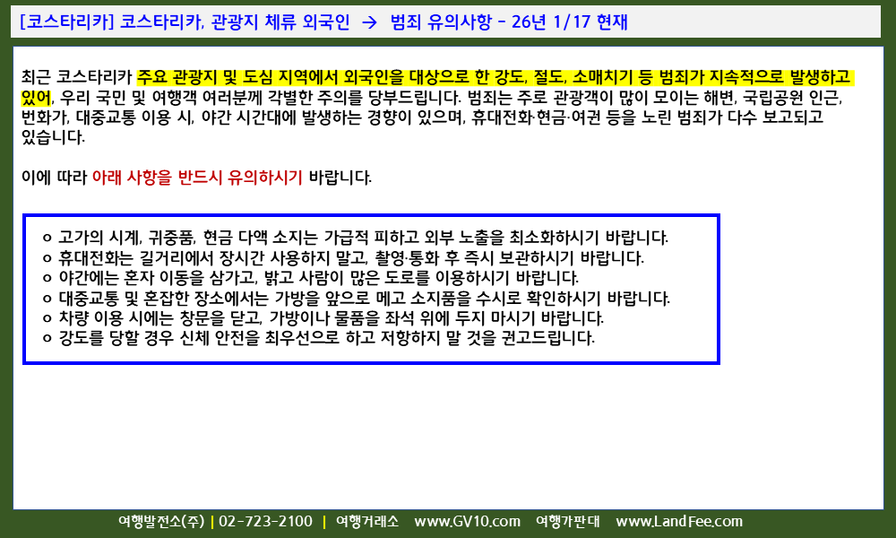 [코스타리카] 코스타리카, 관광지 체류 외국인 -> 범죄 유의사항 - 26년 1/17 현재