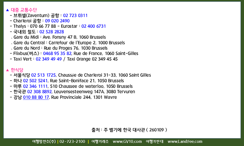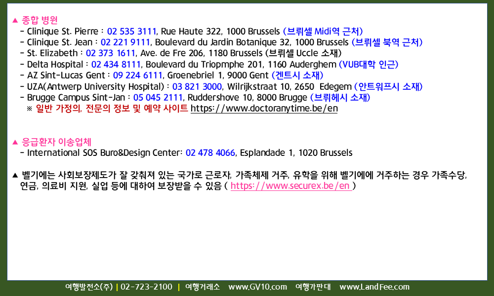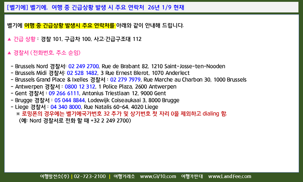 [벨기에] 벨기에, 여행 중 긴급상황 발생 시 주요 연락처 26년 1/9 현재