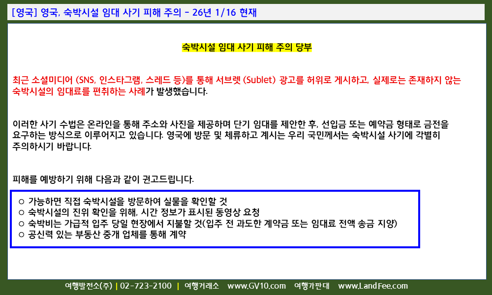 [영국] 영국, 숙박시설 임대 사기 피해 주의 - 26년 1/16 현재