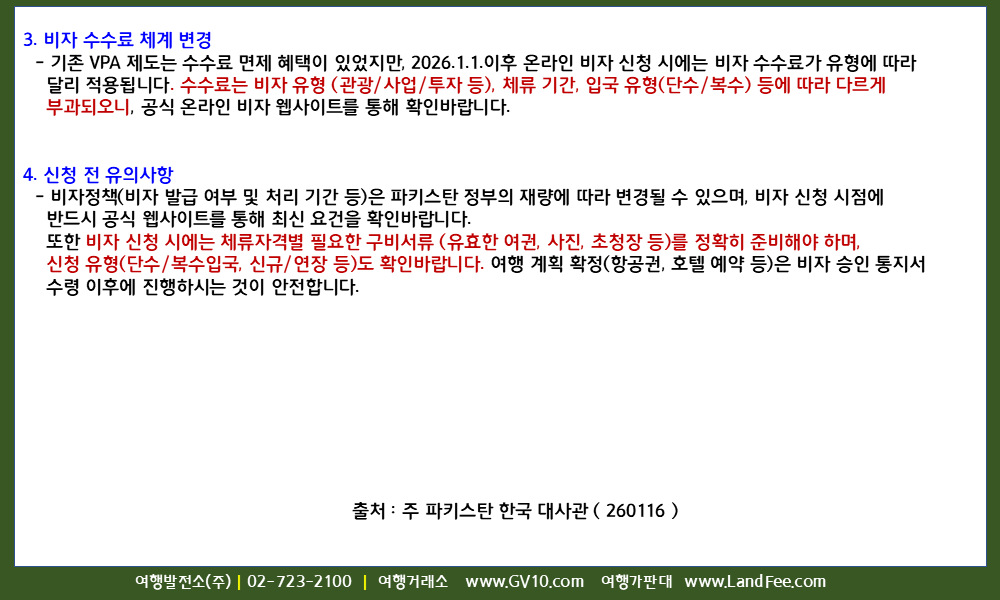 [파키스탄] 파키스탄, 도착전사증 (VPA) 폐지 및 온라인 비자 제도 전면 시행 ( 26년 1/1 부터 ) - 26년 1/16 현재
