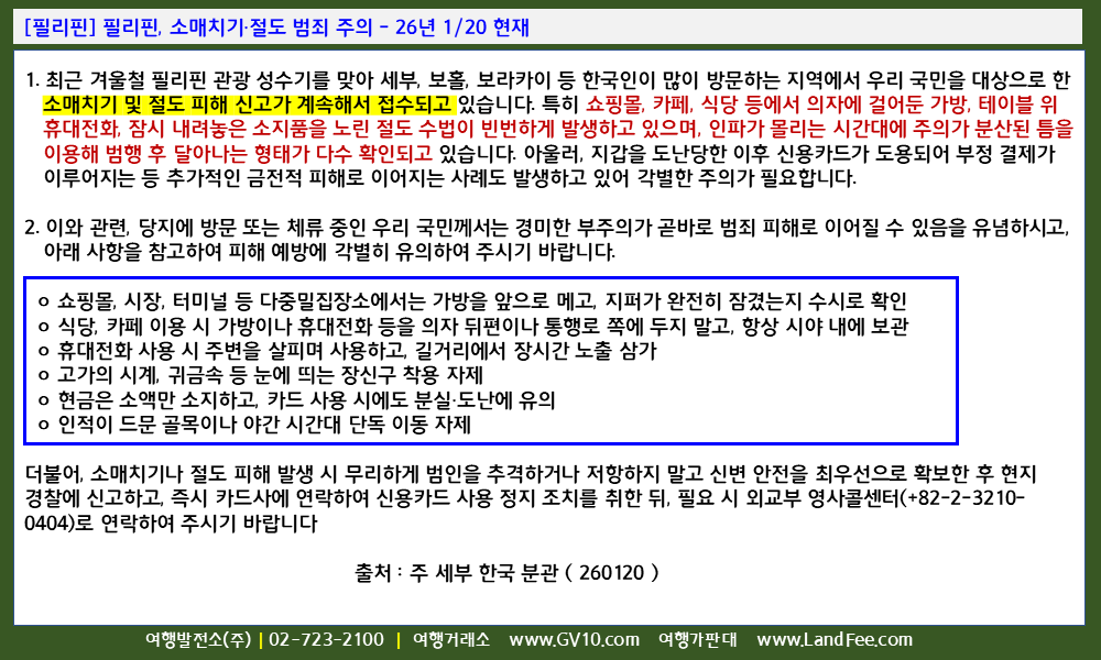 [필리핀] 필리핀, 소매치기·절도 범죄 주의 - 26년 1/20 현재