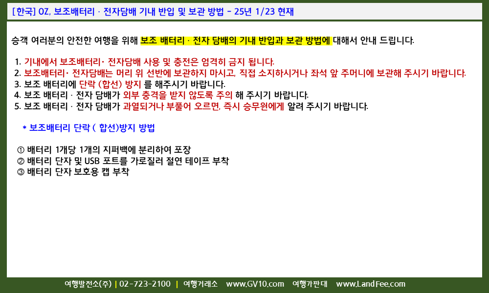 [한국] OZ, 보조배터리 · 전자담배 기내 반입 및 보관 방법 - 25년 1/23 현재