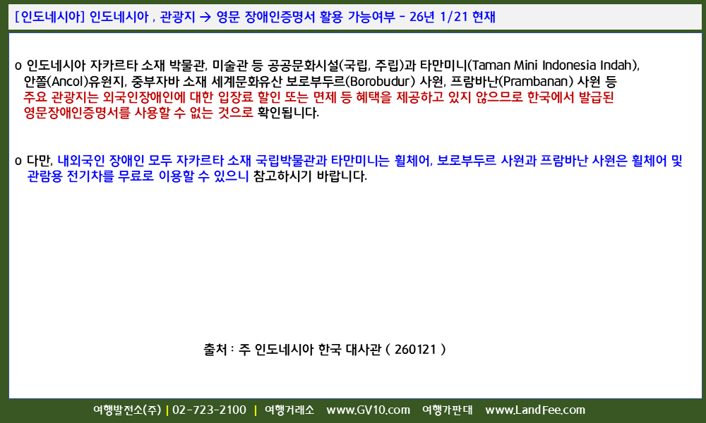[인도네시아] 인도네시아 , 관광지 -> 영문 장애인증명서 활용 가능여부 - 26년 1/21 현재