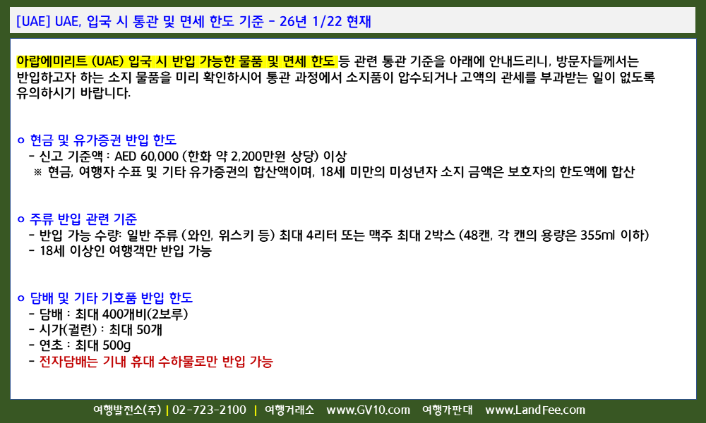 [UAE, 아랍에미리트] UAE, 입국 시 통관 및 면세 한도 기준 - 26년 1/22 현재