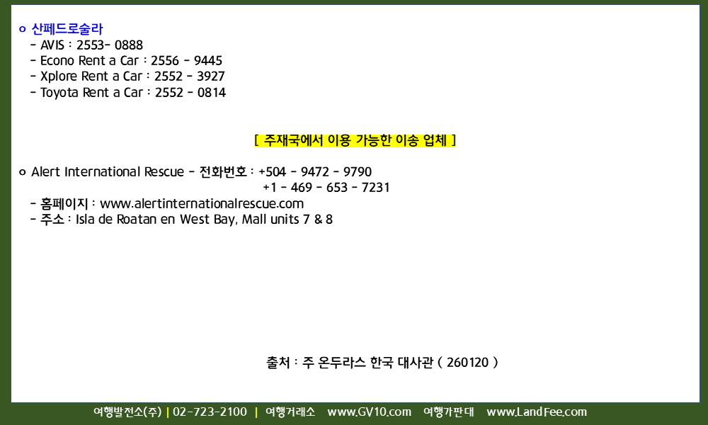 [온두라스] 온두라스, 주요 의료기관, 렌터카, 에어앰뷸런스 정보 - 26년 1/20 현재