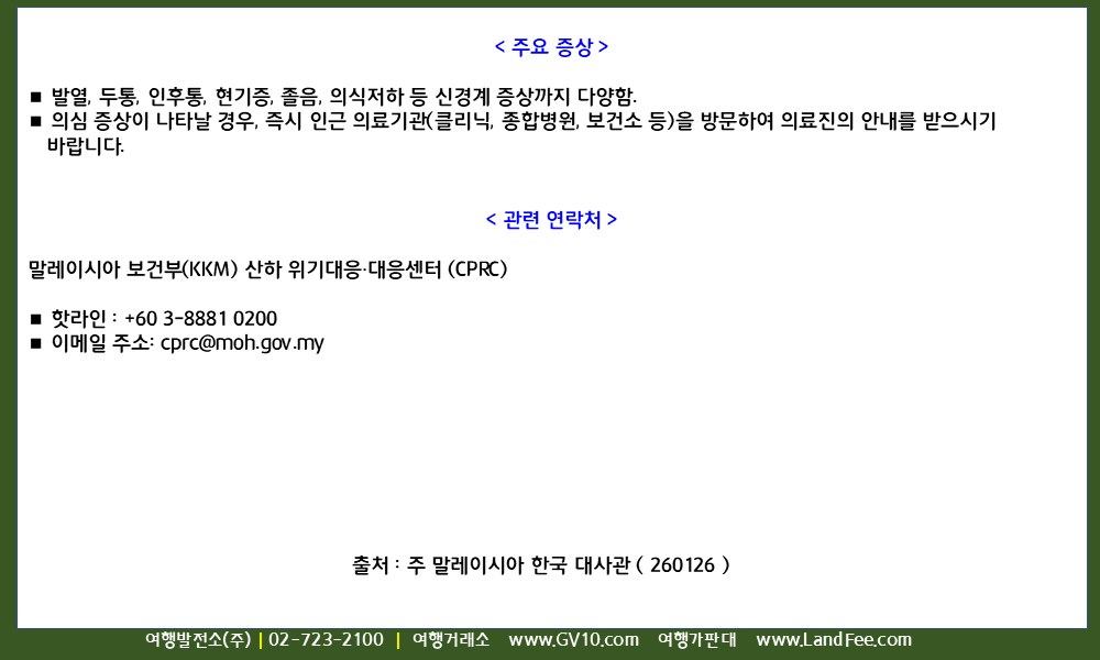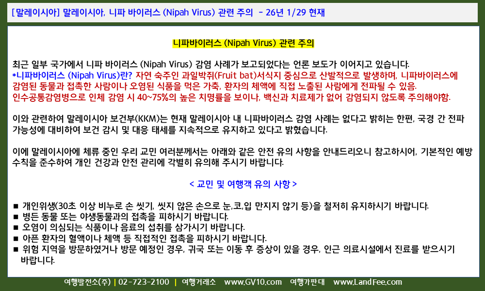 [말레이시아] 말레이시아, 니파 바이러스 (Nipah Virus) 관련 주의 - 26년 1/29 현재