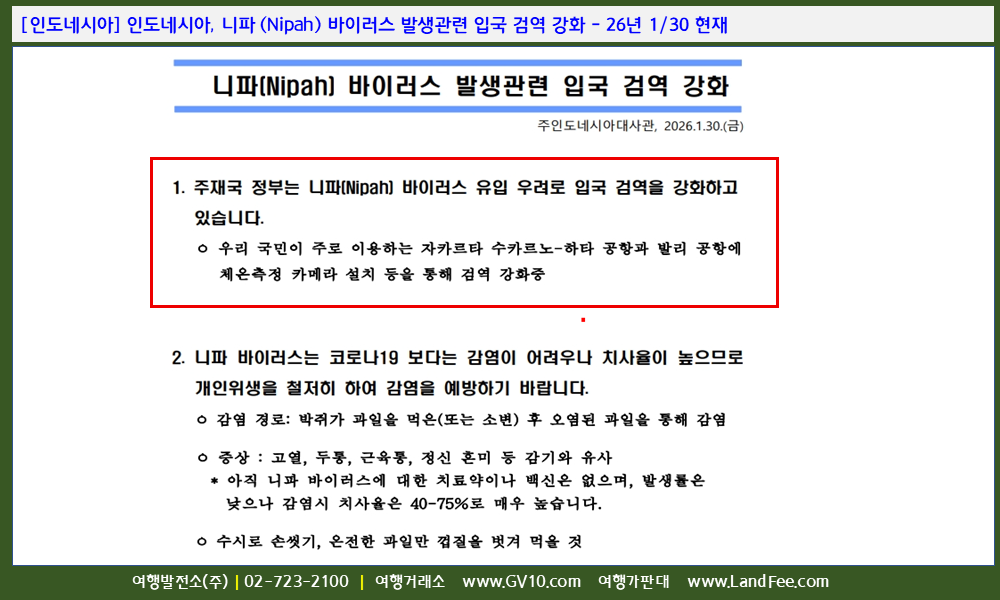 [인도네시아] 인도네시아, 니파 (Nipah) 바이러스 발생관련 입국 검역 강화 - 26년 1/30 현재