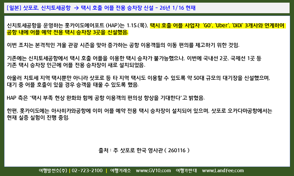 [일본] 삿포로, 신치토세공항 -> 택시 호출 어플 전용 승차장 신설 - 26년 1/16 현재