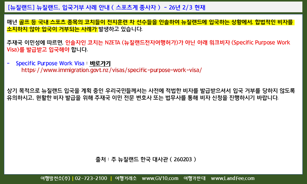 [뉴질랜드] 뉴질랜드, 입국거부 사례 안내 ( 스포츠계 종사자 ) - 26년 2/3 현재