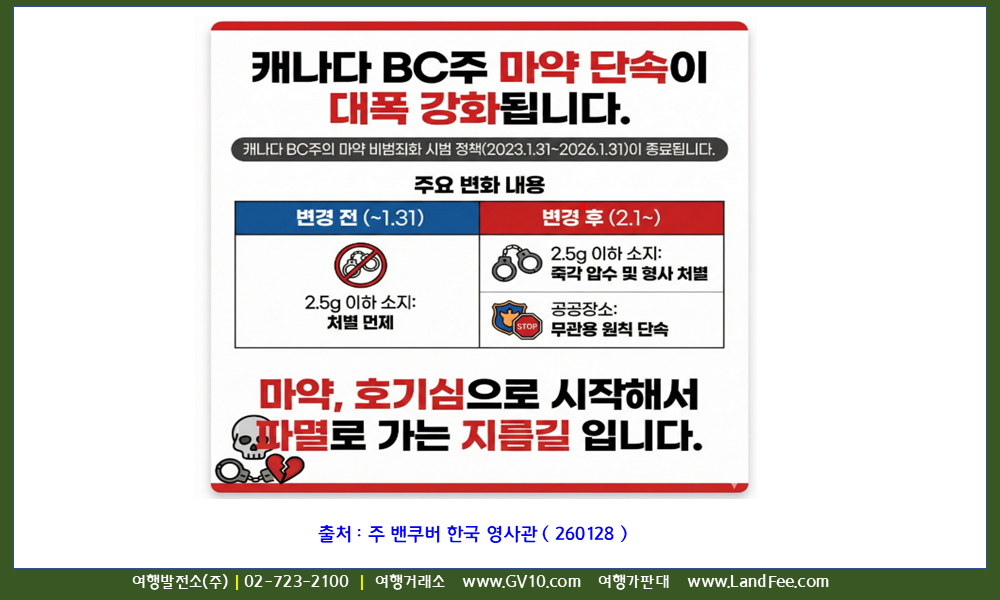 [캐나다] BC주, 마약류 소지 비범죄화 정책 종료 ( 26년 1/31 부터 ) - 26년 1/28 현재