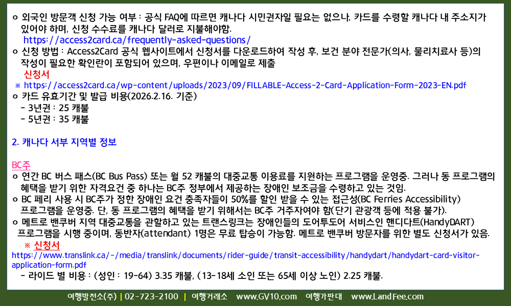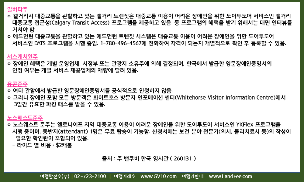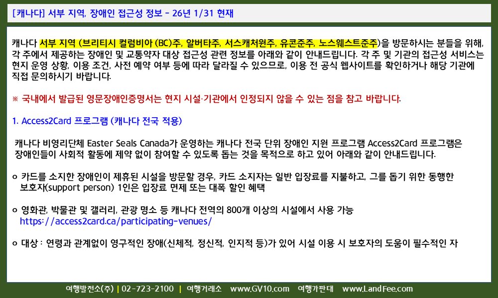 [캐나다] 서부 지역, 장애인 접근성 정보 - 26년 1/31 현재