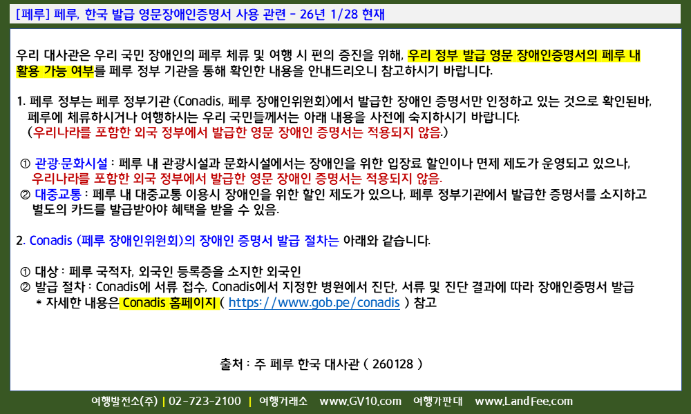 [페루] 페루, 한국 발급 영문장애인증명서 사용 관련 - 26년 1/28 현재