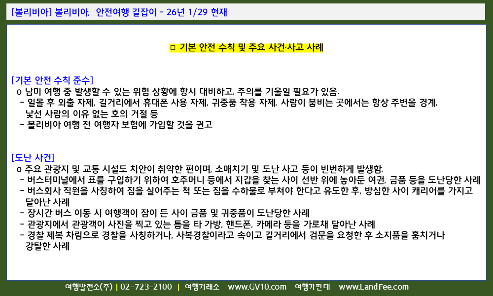 [볼리비아] 볼리비아, 안전여행 길잡이 - 26년 1/29 현재